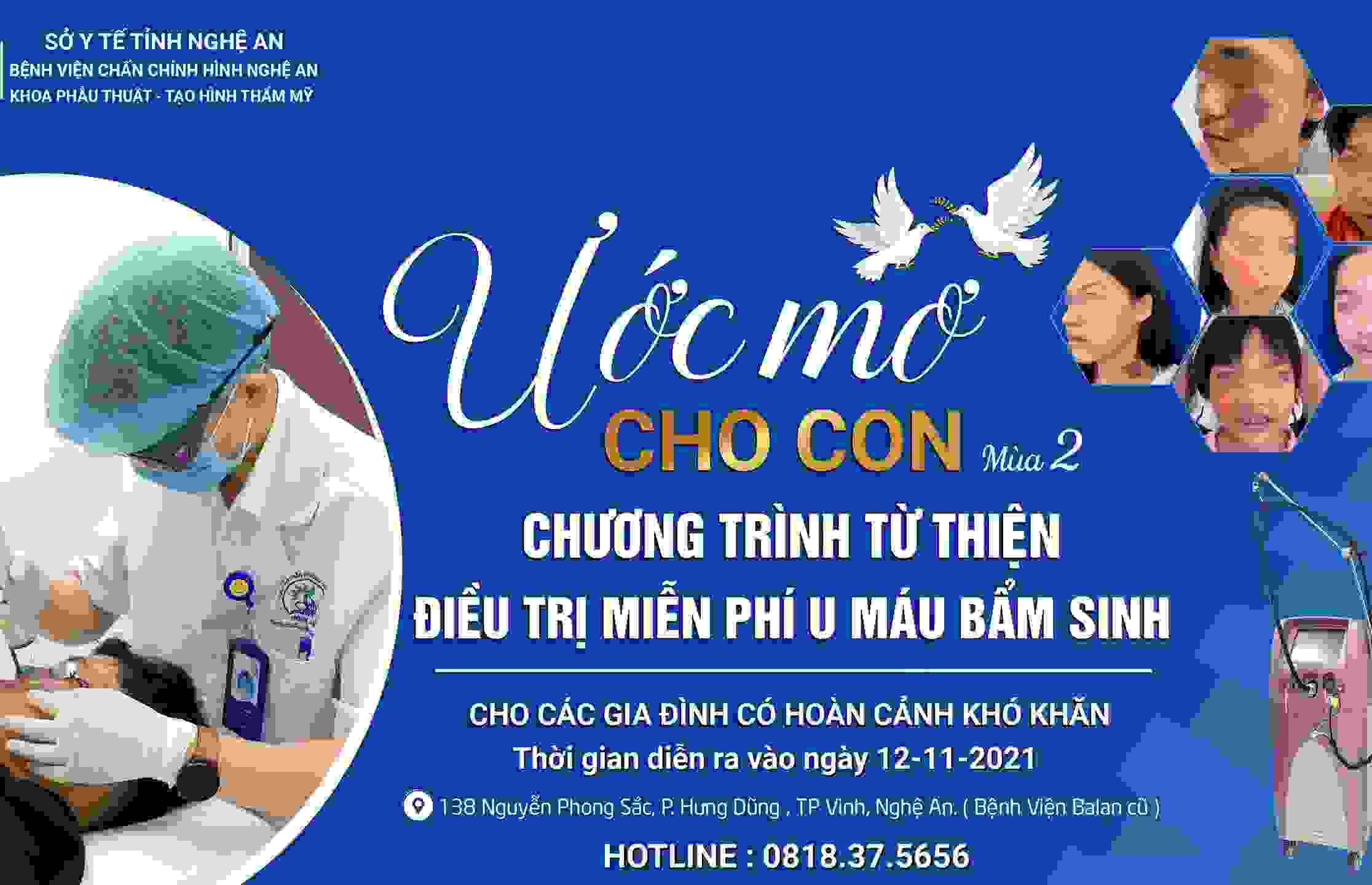 Với mong muốn tạo cơ hội điều trị thành công u máu, bớt máu bẩm sinh, giúp những trẻ em kém may mắn vượt qua rào cản về ngoại hình, để có tương lai tươi sáng hơn, Khoa phẫu thuật tạo hình thẩm mỹ - Bệnh viện Chấn thương chỉnh hình Nghệ An tiếp tục tổ chức chương trình thiện nguyện “Ước mơ cho con” mùa 2, vào ngày 12/11/2022.