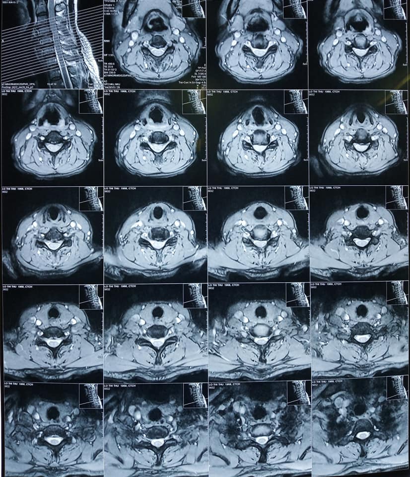 Sau khi được bác sĩ thăm khám, bệnh nhân được chẩn đoán bị Thasit vị đĩa đệm cột sống cổ C4C5 C5C6 và  phù tủy cổ ngang mức C5.