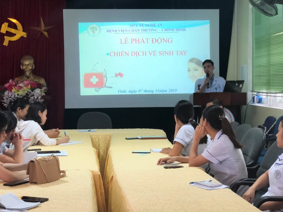 Hưởng ứng chiến dịch “Phòng ngừa nhiễm khuẩn do chăm sóc y tế - chính từ nơi bàn tay bạn” do Tổ chức Y tế Thế giới (WHO) phát động, ngày hôm qua, 7/11/2019, Khoa kiểm soát nhiễm khuẩn - Bệnh viện Chấn thương chỉnh hình Nghệ An đã tổ chức lễ phát động chiến dịch vệ sinh tay tới toàn thể nhân viên y tế. Toàn thể cán bộ công nhân viên Bệnh viện đã cam kết cùng nhau tuân thủ và thực hiện theo “5 thời điểm cần rửa tay đối với nhân viên y tế“ và “quy trình rửa tay 6 bước của Bộ y tế” để cùng chung tay chống lại nguy cơ nhiễm khuẩn.