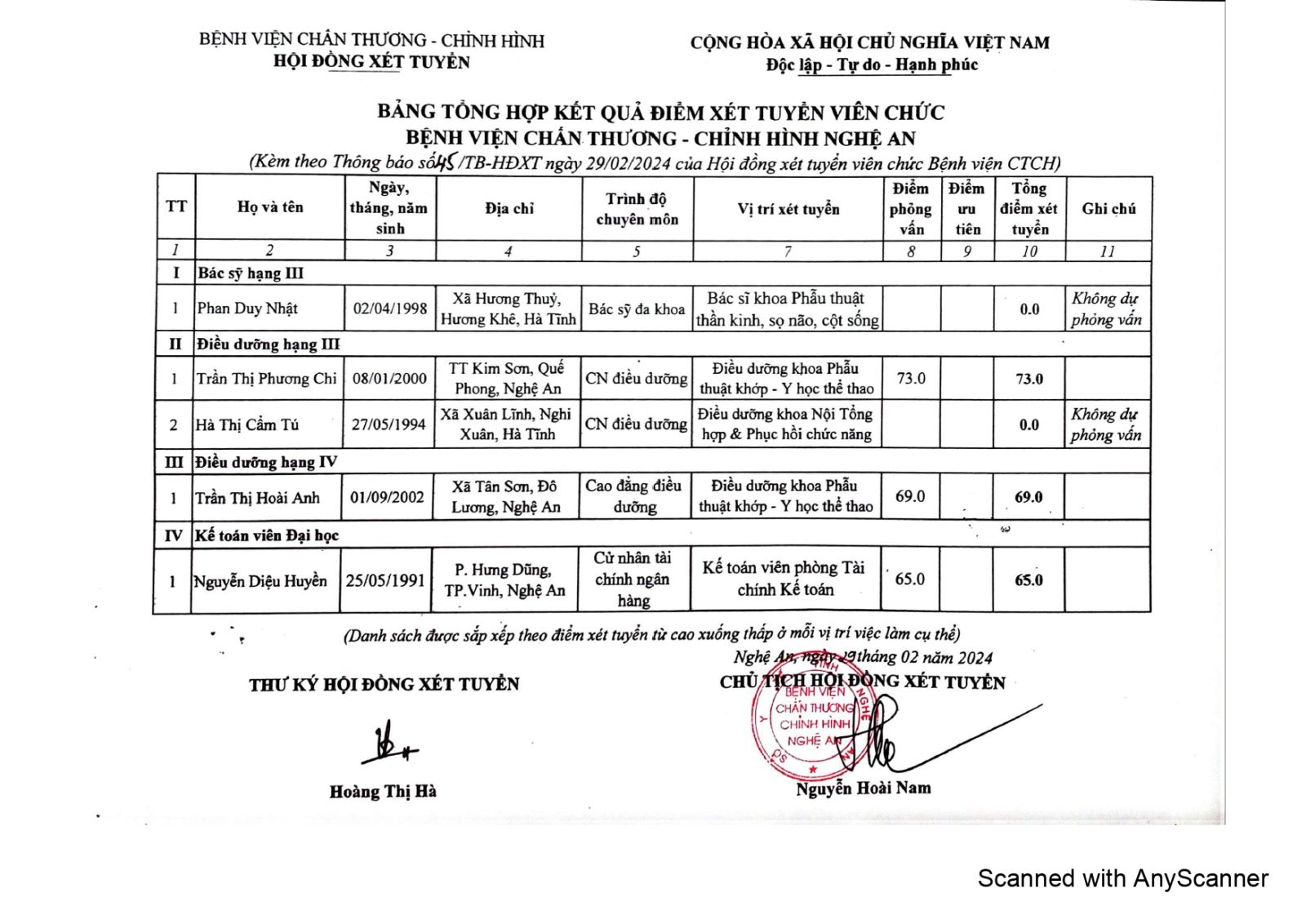 Bệnh viện Chấn thương Chỉnh hình Nghệ An xin thông báo kết quả xét tuyển viên chức như sau: