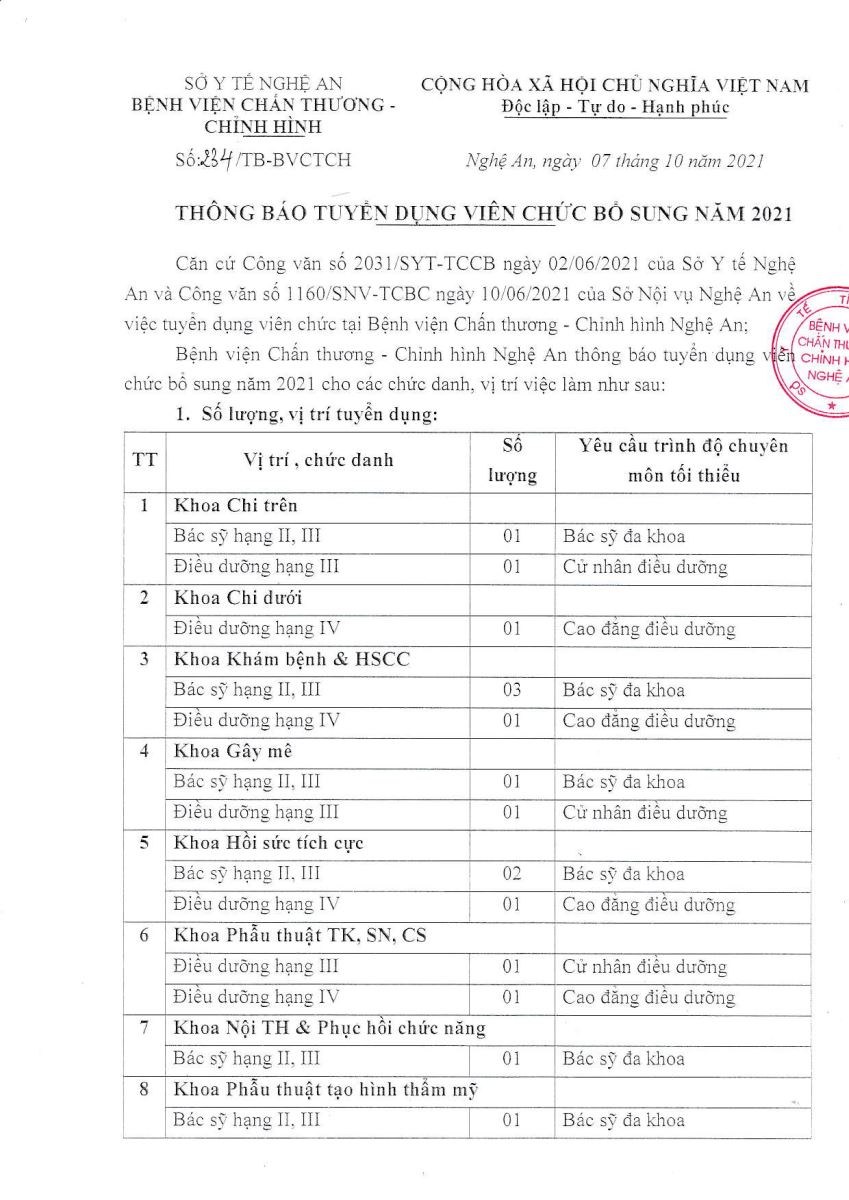 Bệnh viện Chấn thương Chỉnh hình Nghệ An xin thông báo tuyển dụng viên chức bổ sung năm 2021 như sau:
